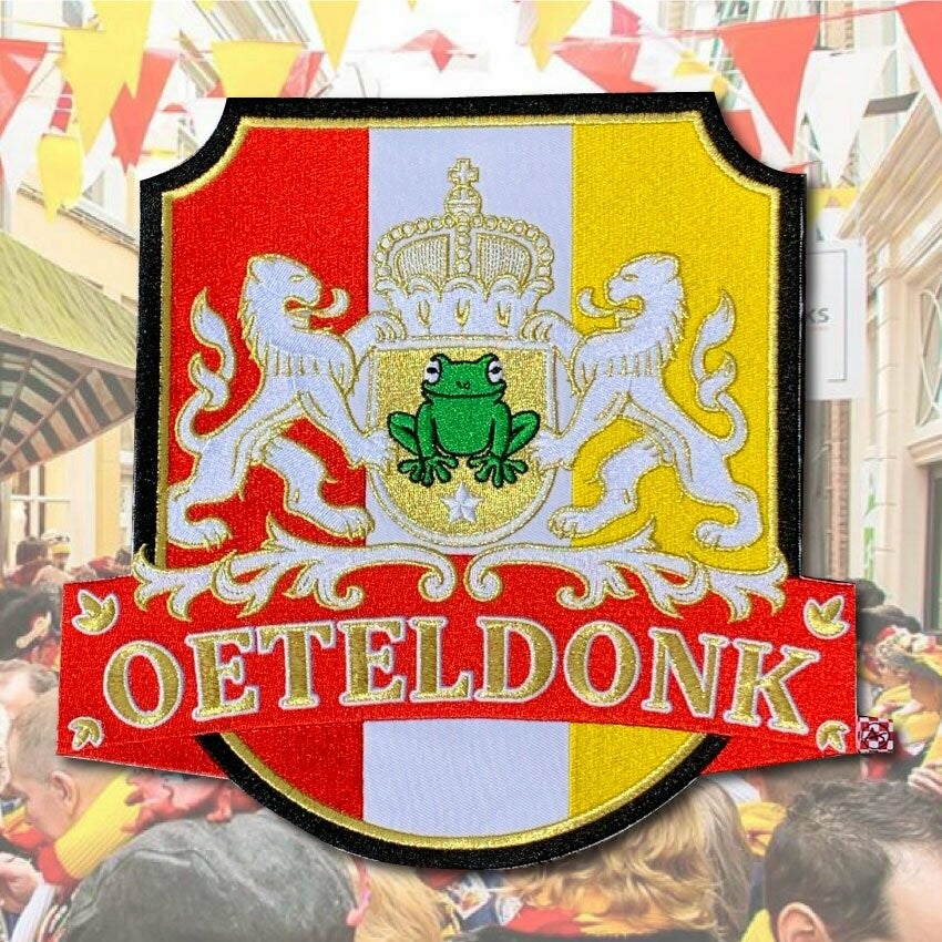 Prachtig rugembleem Oeteldonk. Door het vele gerbuik van gouddraad heeft dit embleem een zeer sjieke uitstraling! Een echt bikvanger op jouw Oeteldonkse jasje.